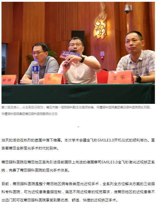7月29日,由莆田市医学会、莆田市科学技术协会主办,牛八体育集团莆田眼科医院、赵堪兴院士专家工作站协办的第三届莆田眼科近视手术学术会暨德国蔡司全飞秒SMILE3.0开机仪式在莆田隆重举行。