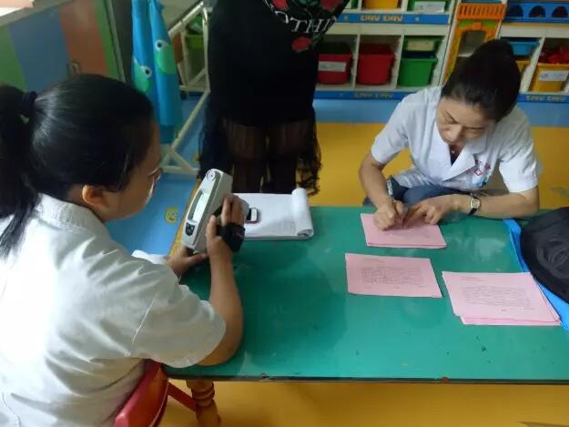 活动现场,医生在用 的仪器给孩子们进行视力检查。尽管幼儿园的小朋友活泼好动,又不明所以,医生还是耐心的一遍又一遍的重复引导。